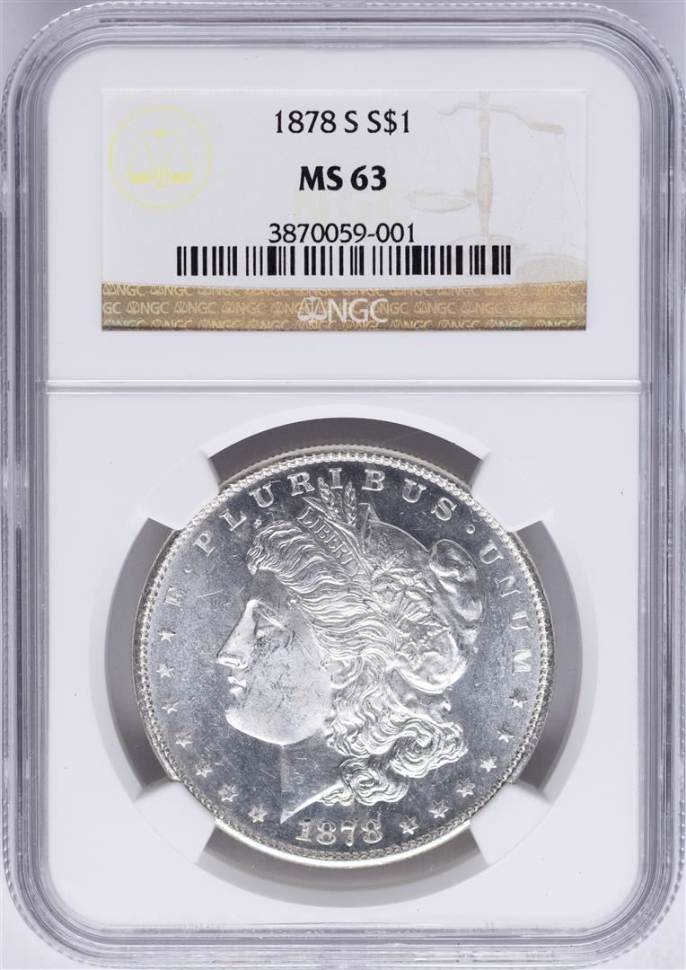 One 1878-S $1 Morgan Silver Dollar Coin NGC MS63. NGC Certified.