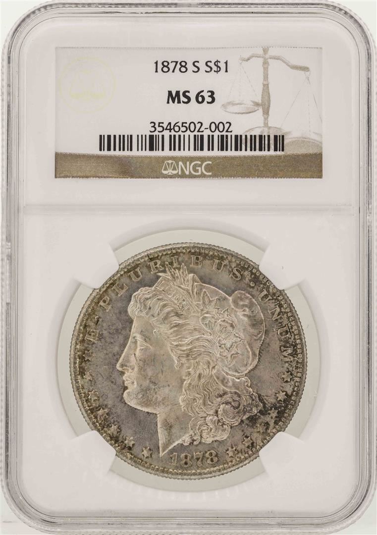 One 1878-S $1 Morgan Silver Dollar Coin NGC MS63. NGC Certified.