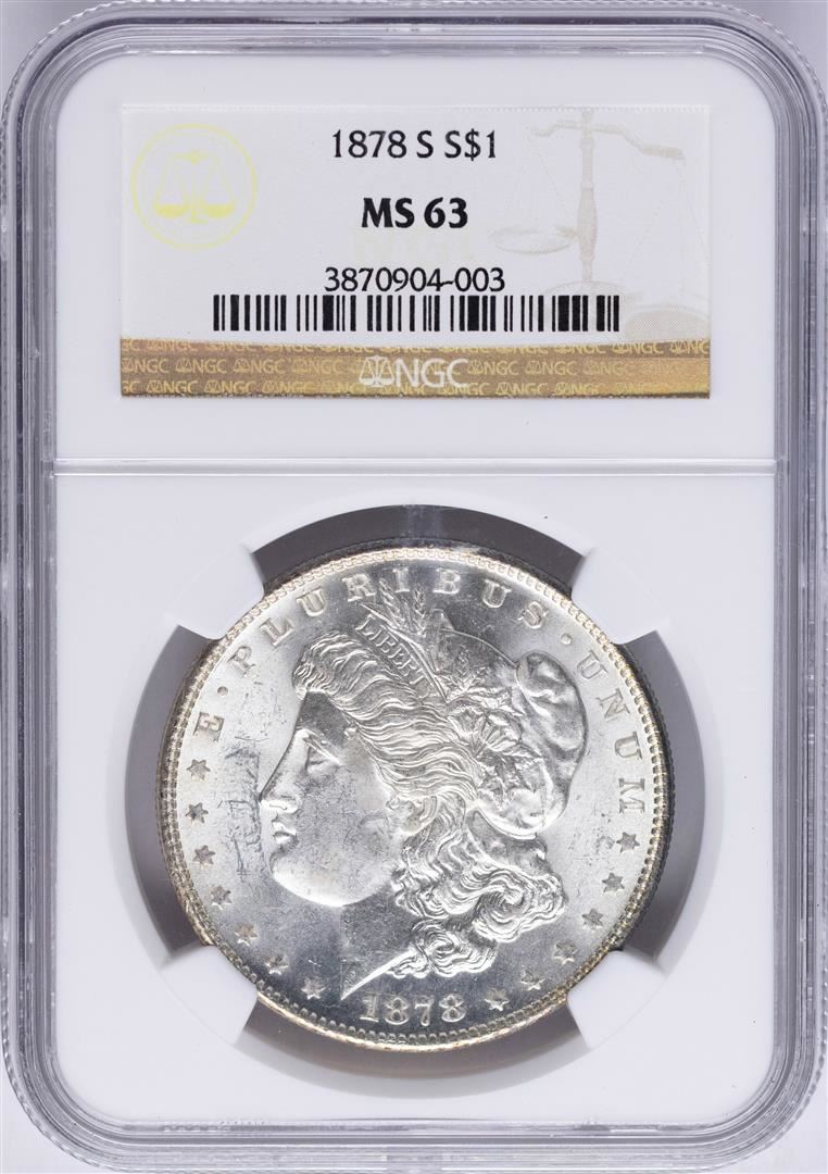 One 1878-S $1 Morgan Silver Dollar Coin NGC MS63. NGC Certified.