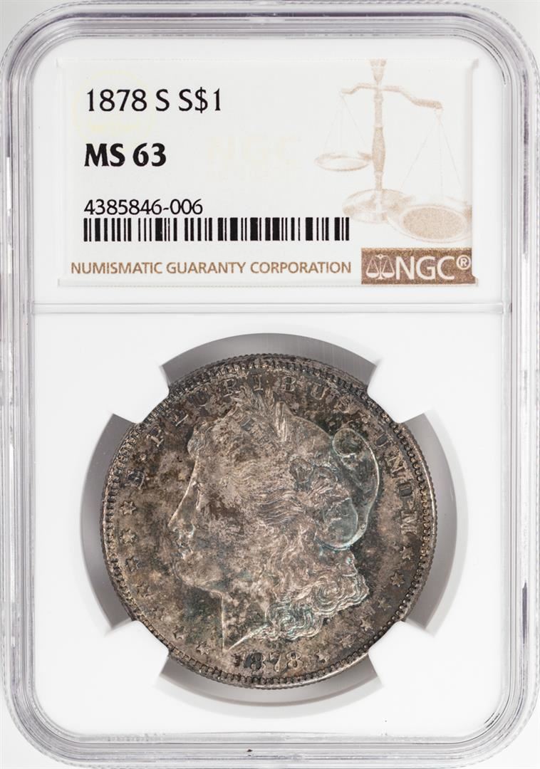 One 1878-S $1 Morgan Silver Dollar Coin NGC MS63. NGC Certified.