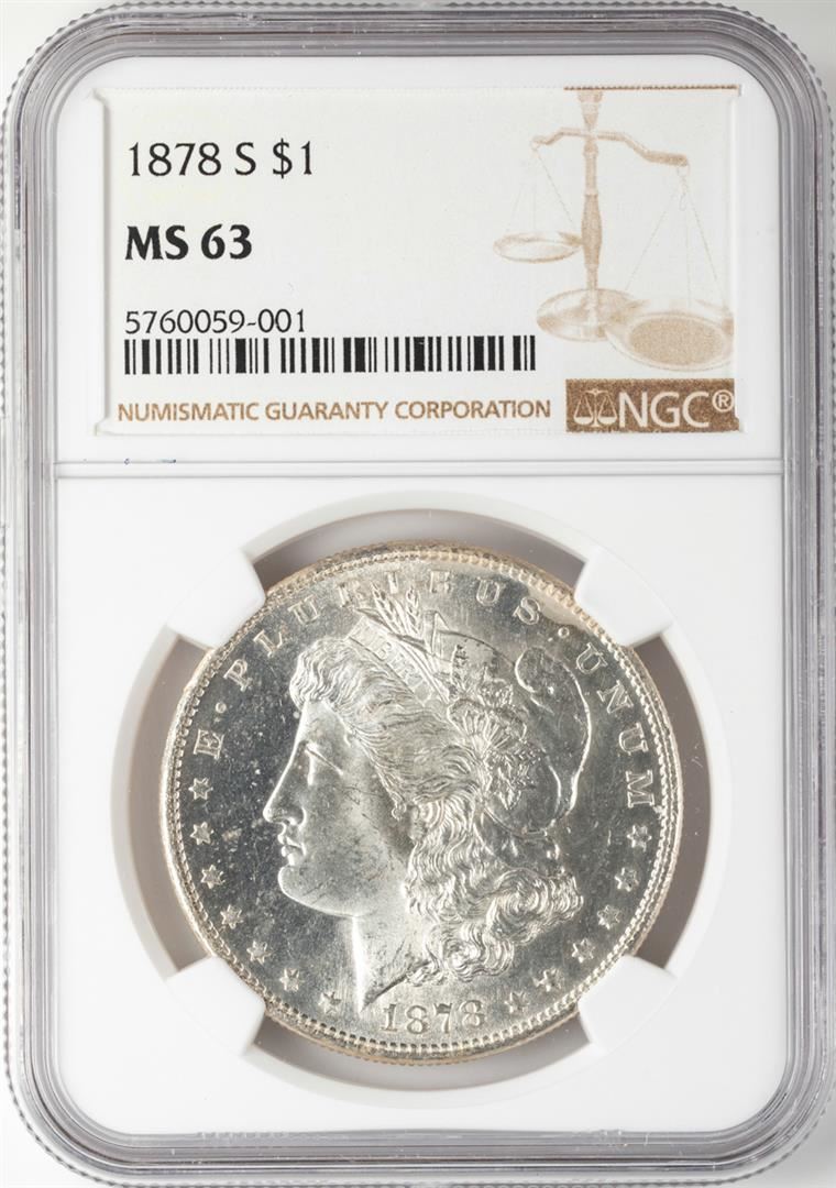 One 1878-S $1 Morgan Silver Dollar Coin NGC MS63. NGC Certified.