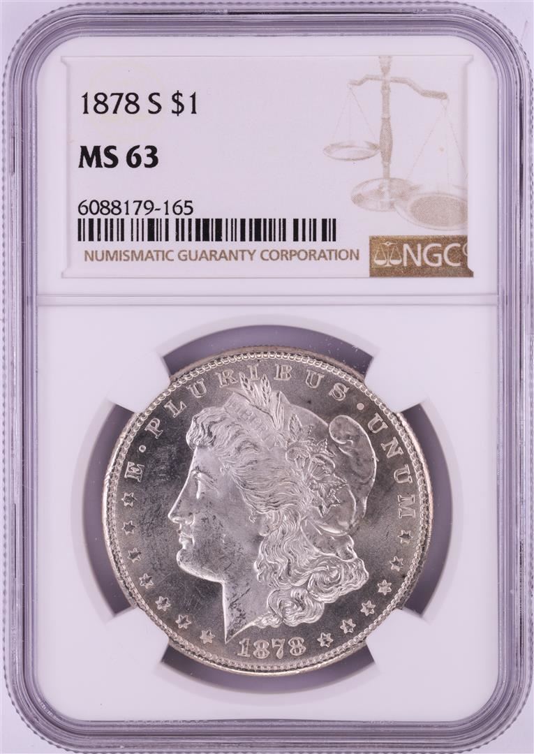 One 1878-S $1 Morgan Silver Dollar Coin NGC MS63. NGC Certified.