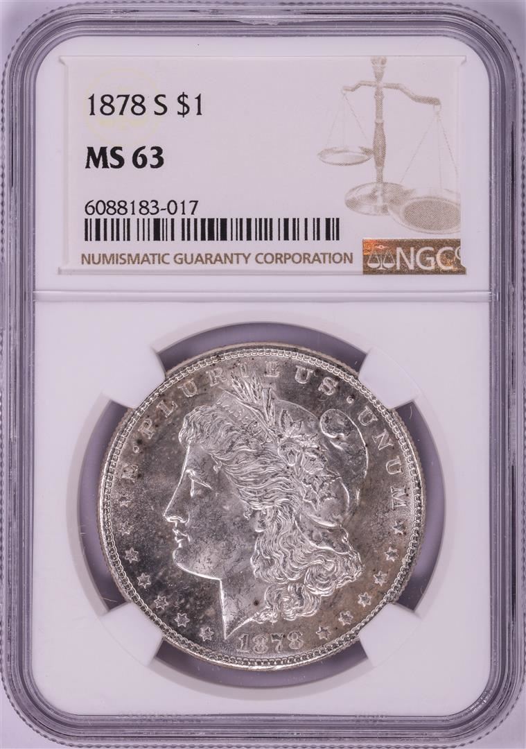 One 1878-S $1 Morgan Silver Dollar Coin NGC MS63. NGC Certified.