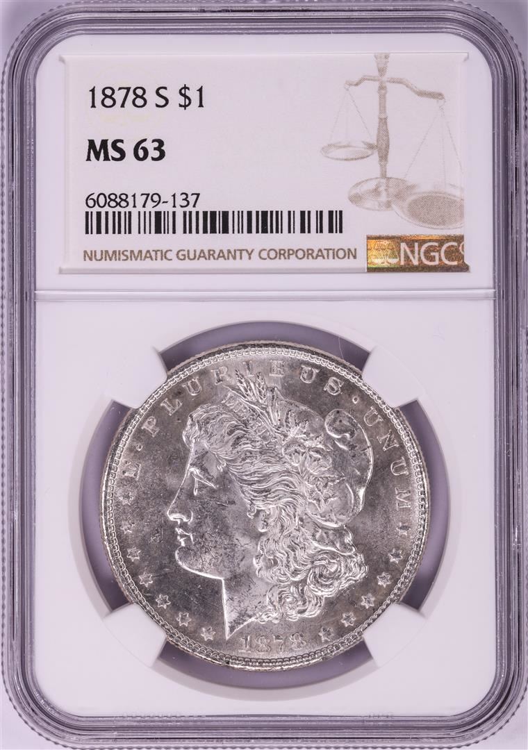 One 1878-S $1 Morgan Silver Dollar Coin NGC MS63. NGC Certified.