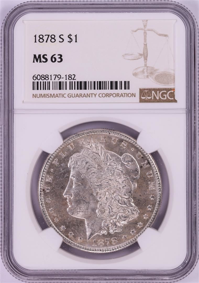 One 1878-S $1 Morgan Silver Dollar Coin NGC MS63. NGC Certified.