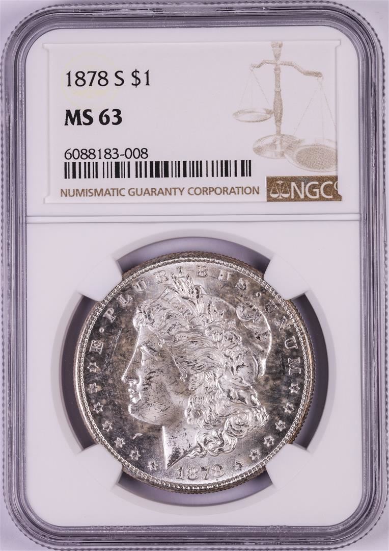 One 1878-S $1 Morgan Silver Dollar Coin NGC MS63. NGC Certified.