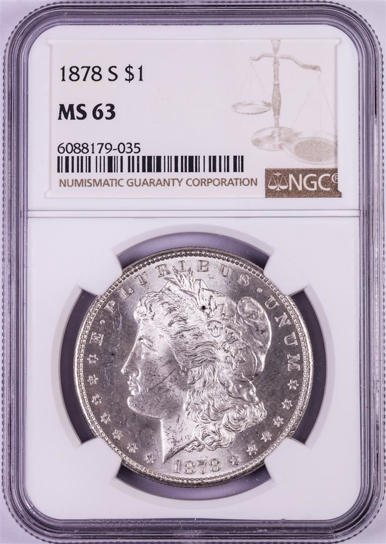 One 1878-S $1 Morgan Silver Dollar Coin NGC MS63. NGC Certified.