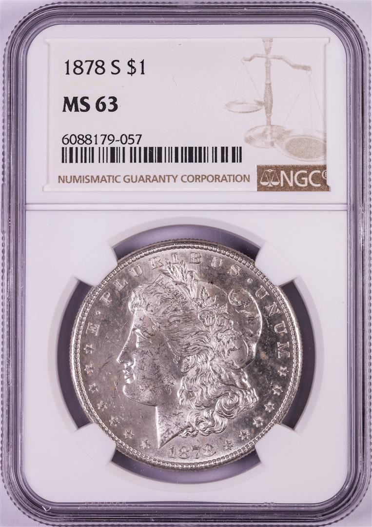 One 1878-S $1 Morgan Silver Dollar Coin NGC MS63. NGC Certified.