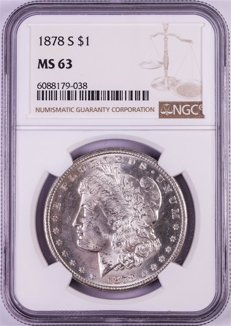 One 1878-S $1 Morgan Silver Dollar Coin NGC MS63. NGC Certified.