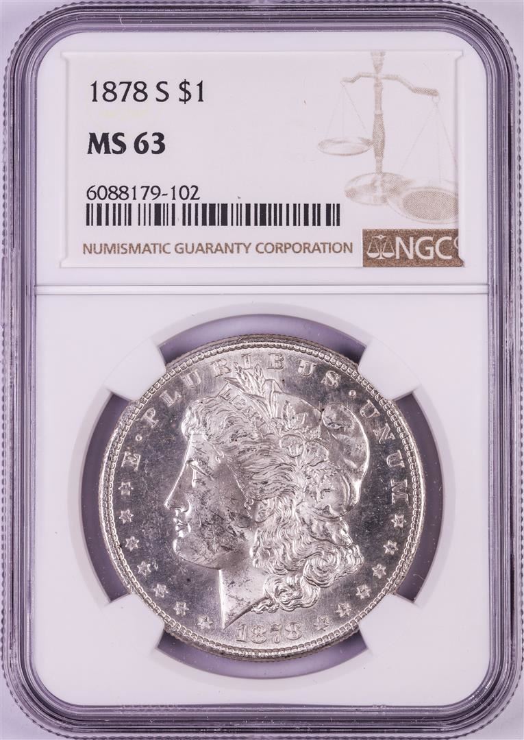 One 1878-S $1 Morgan Silver Dollar Coin NGC MS63. NGC Certified.