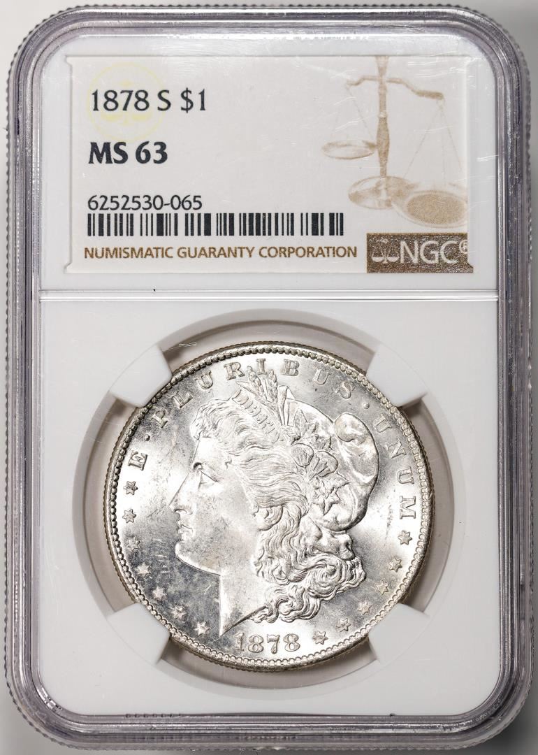 One 1878-S $1 Morgan Silver Dollar Coin NGC MS63. NGC Certified.