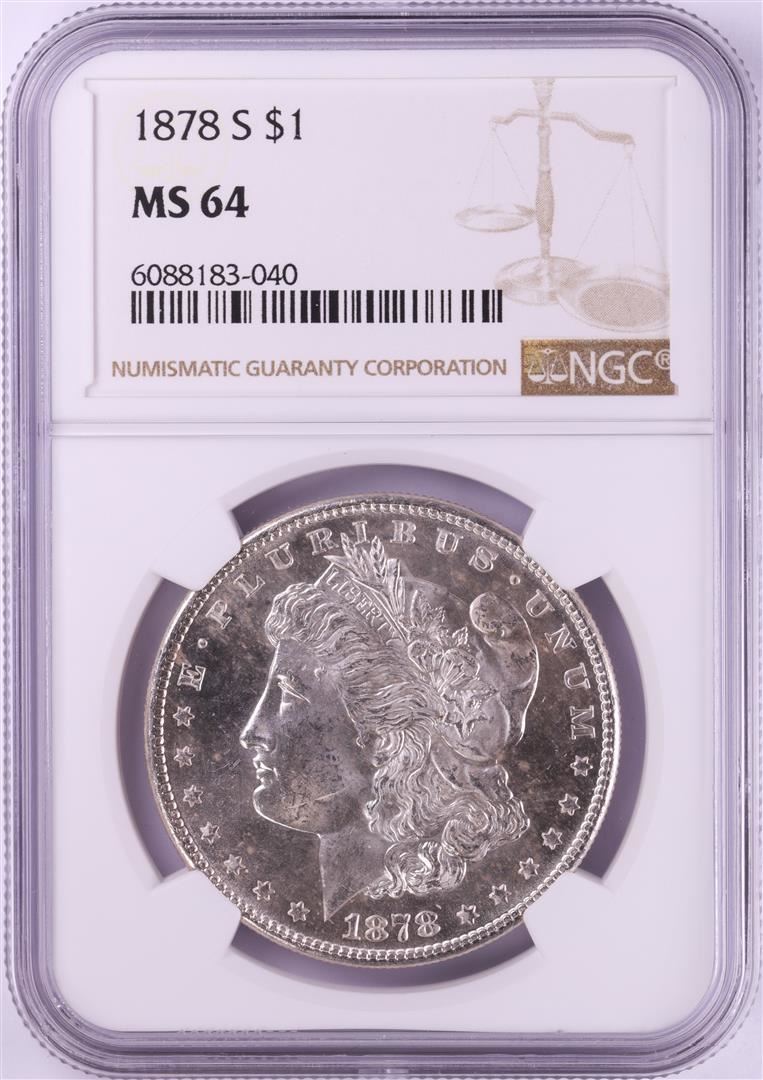 One 1878-S $1 Morgan Silver Dollar Coin NGC MS64. NGC Certified.