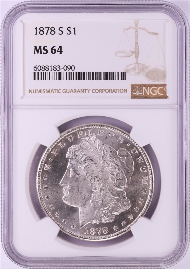 One 1878-S $1 Morgan Silver Dollar Coin NGC MS64. NGC Certified.