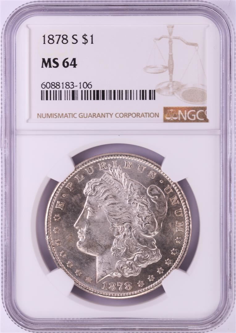 One 1878-S $1 Morgan Silver Dollar Coin NGC MS64. NGC Certified.
