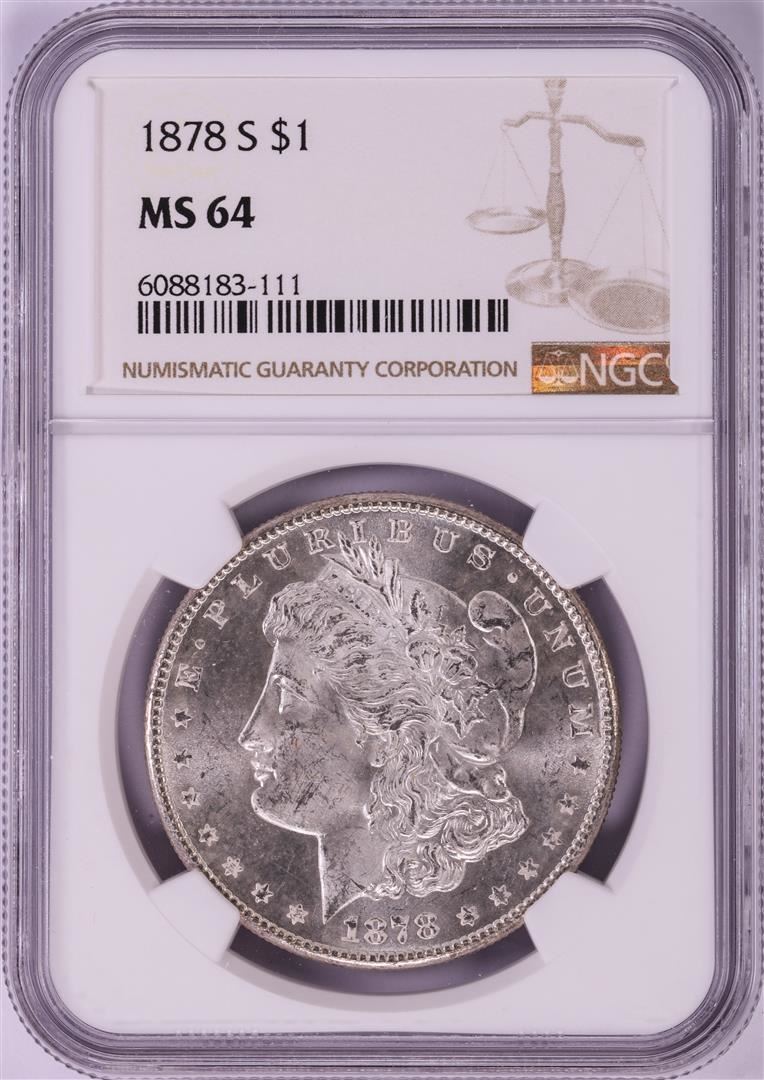 One 1878-S $1 Morgan Silver Dollar Coin NGC MS64. NGC Certified.