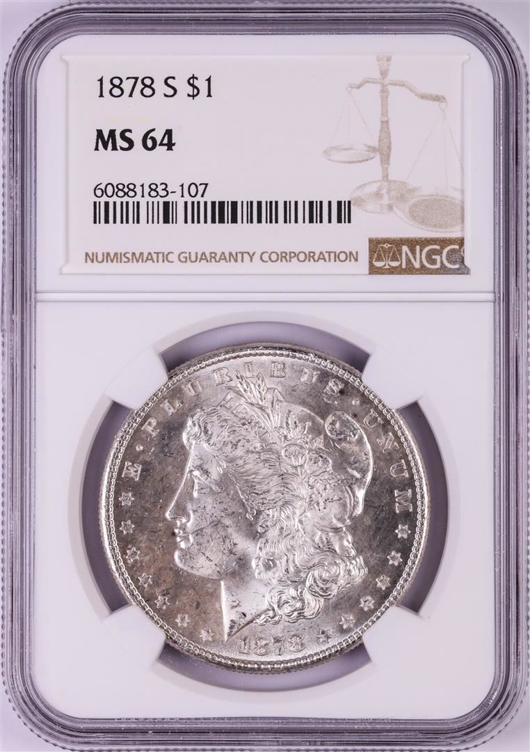 One 1878-S $1 Morgan Silver Dollar Coin NGC MS64. NGC Certified.
