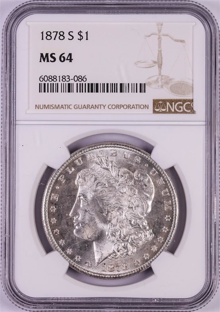 One 1878-S $1 Morgan Silver Dollar Coin NGC MS64. NGC Certified.