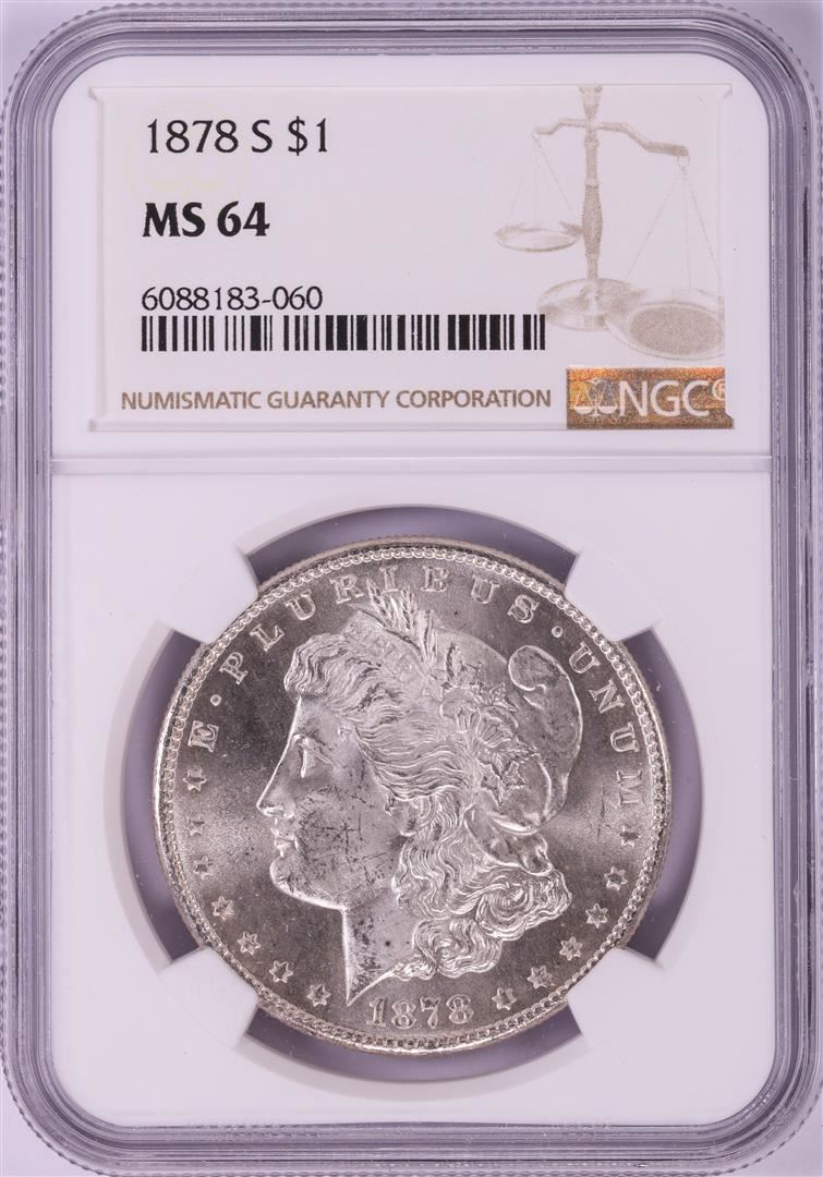 One 1878-S $1 Morgan Silver Dollar Coin NGC MS64. NGC Certified.