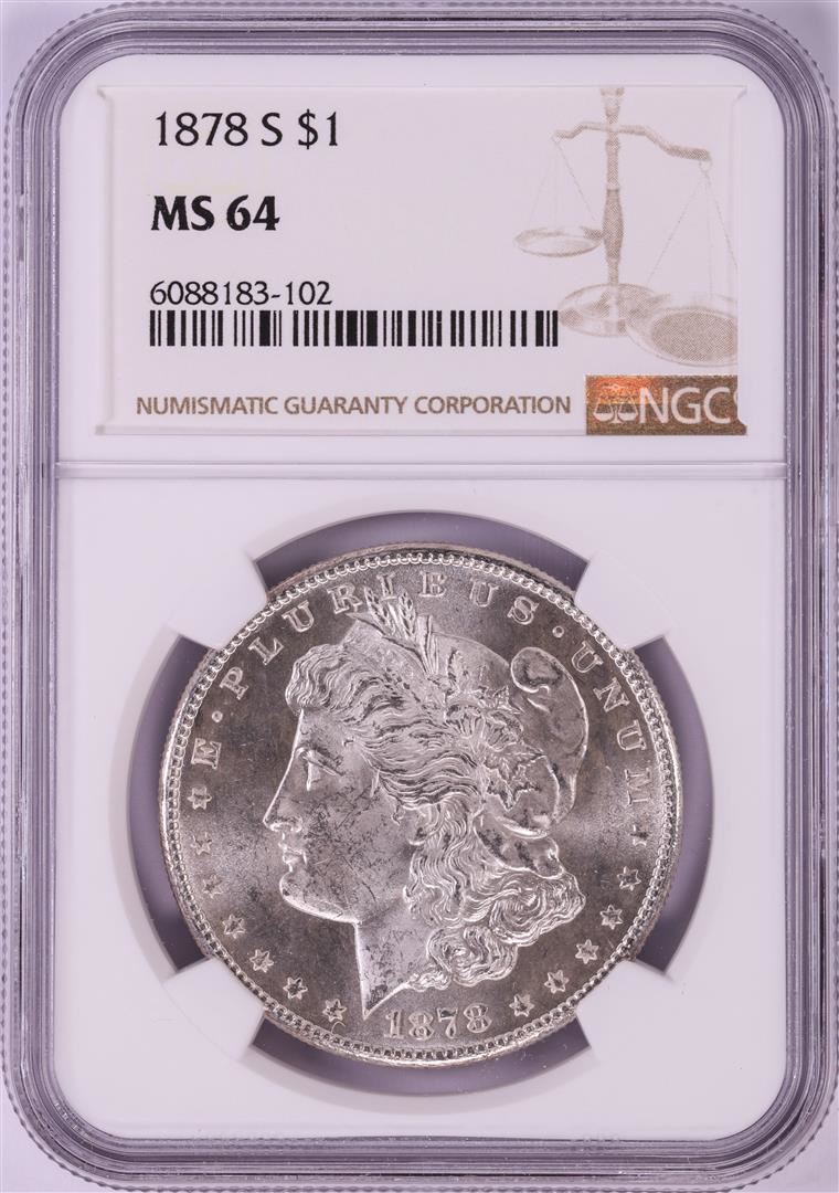 One 1878-S $1 Morgan Silver Dollar Coin NGC MS64. NGC Certified.