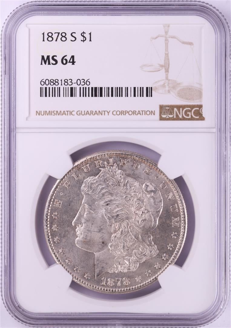 One 1878-S $1 Morgan Silver Dollar Coin NGC MS64. NGC Certified.