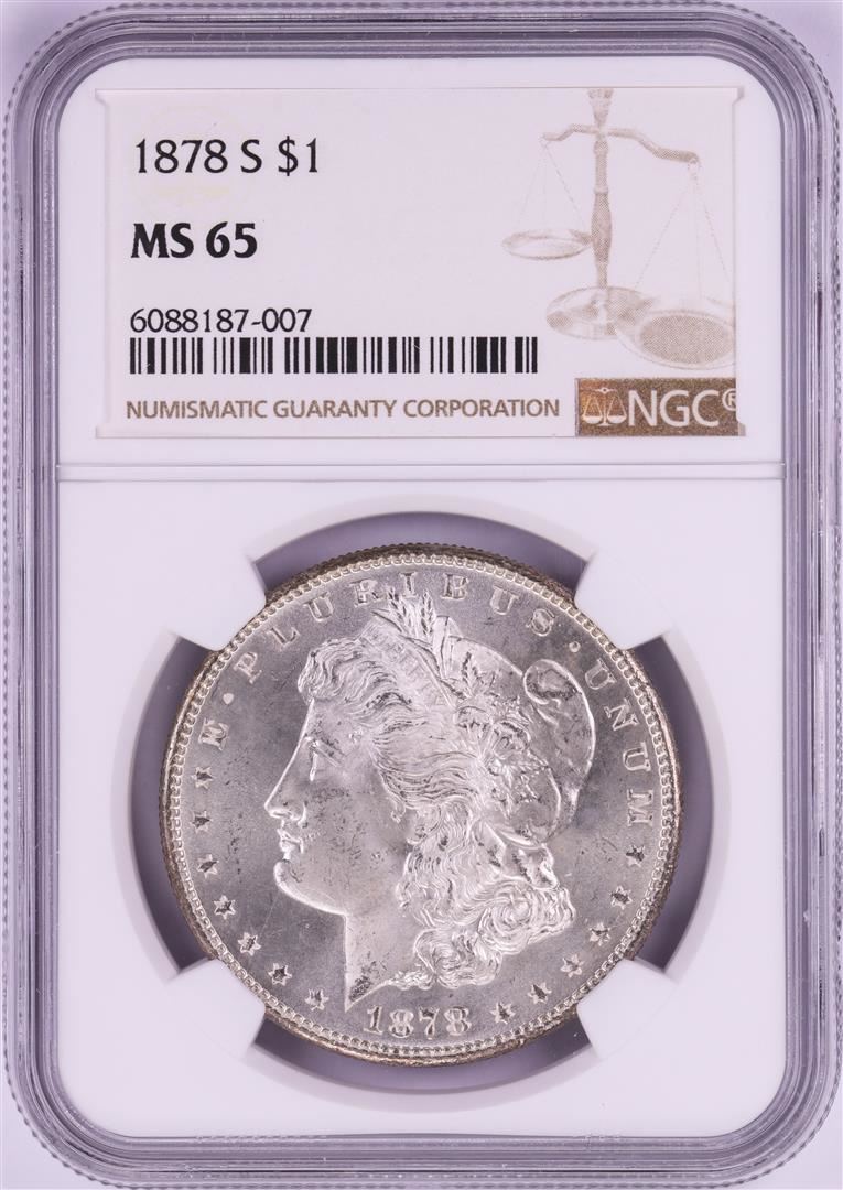 One 1878-S $1 Morgan Silver Dollar Coin NGC MS65. NGC Certified.