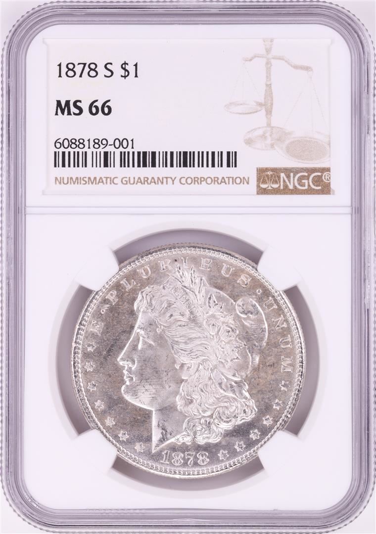 One 1878-S $1 Morgan Silver Dollar Coin NGC MS66. NGC Certified.