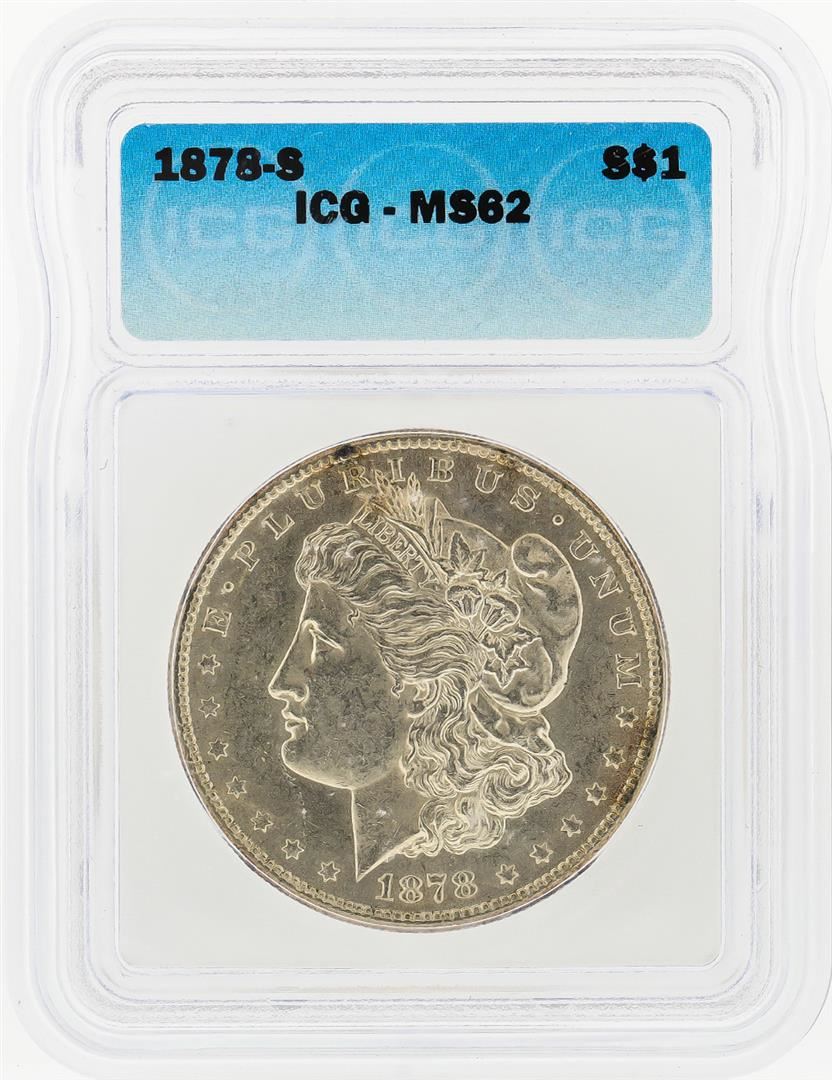 One 1878-S $1 Morgan Silver Dollar ICG Graded MS62. ICG Certified.