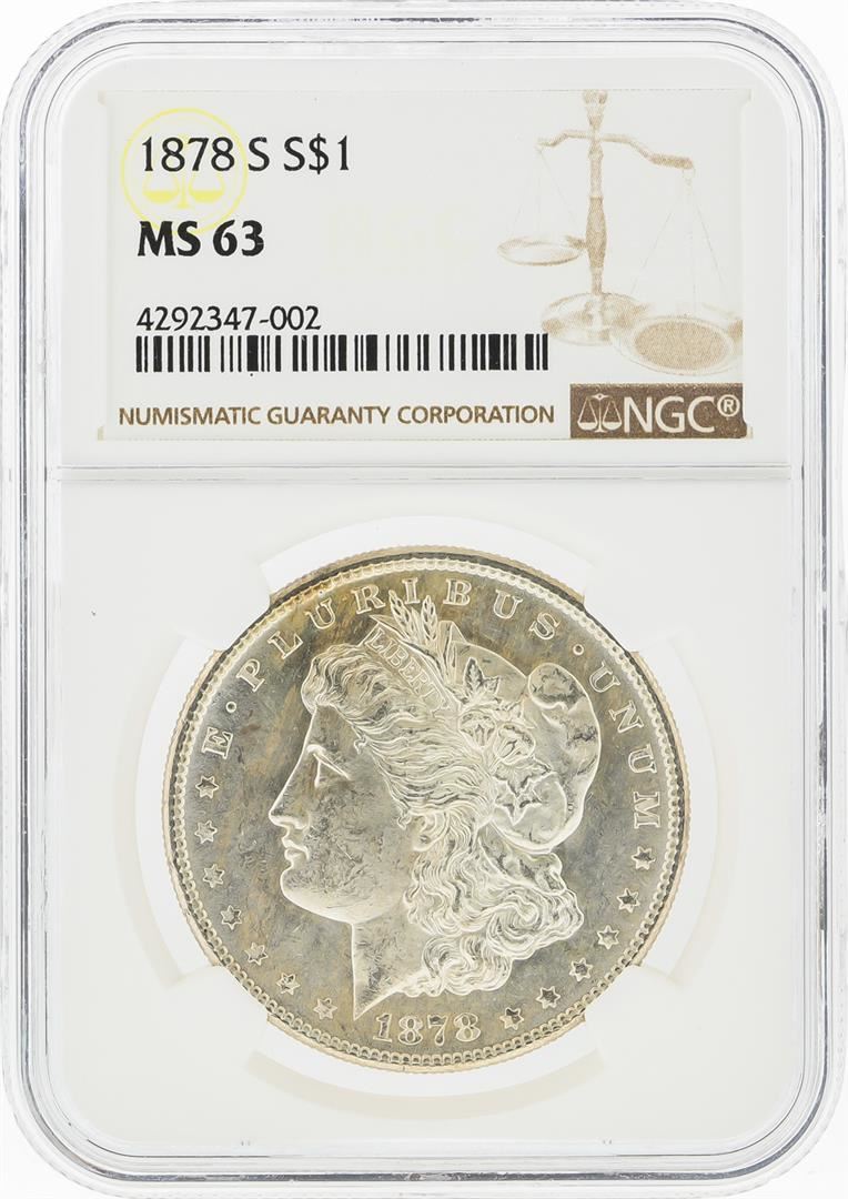 One 1878-S $1 Morgan Silver Dollar NGC Graded MS63. NGC Certified.