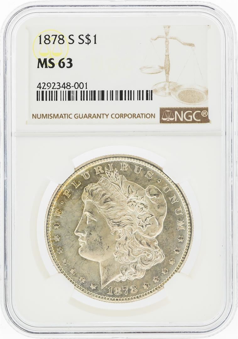 One 1878-S $1 Morgan Silver Dollar NGC Graded MS63. NGC Certified.