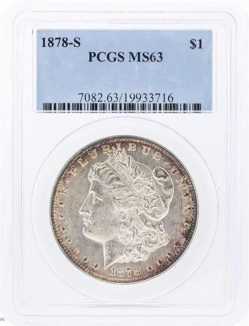 One 1878-S $1 Morgan Silver Dollar PCGS Graded MS63. PCGS Graded.