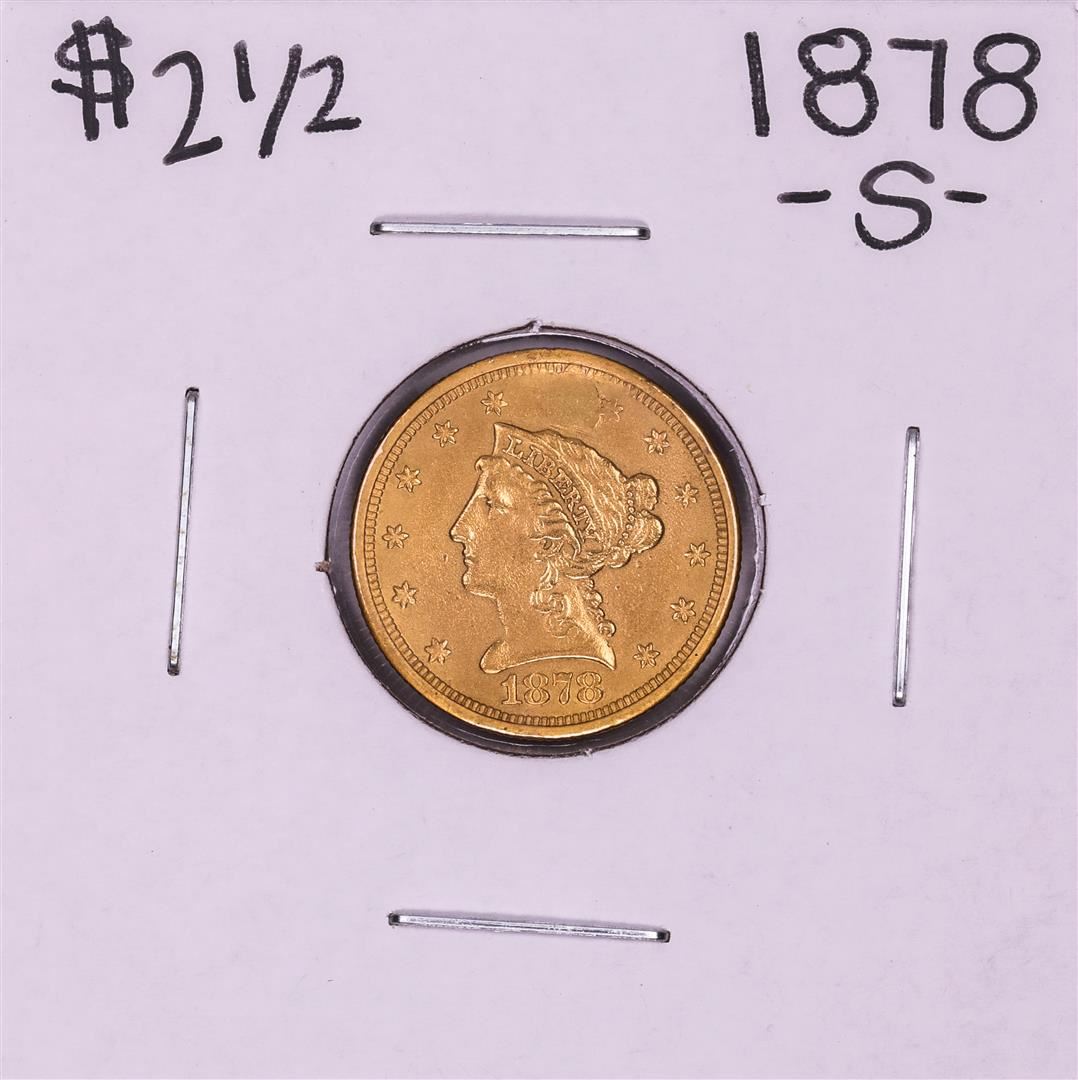 One 1878-S $2 1/2 Liberty Head Quarter Eagle Gold Coin, there is damage to the reverse towards the bottom.