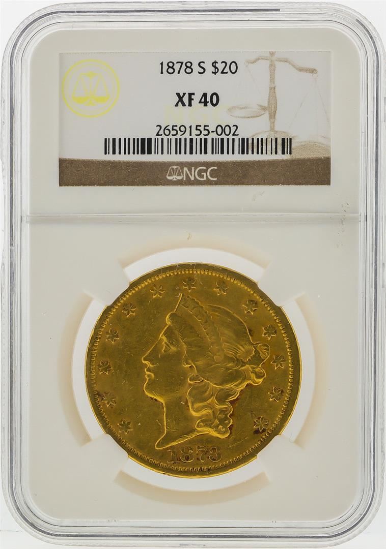 One 1878-S $20 Liberty Head Double Eagle Gold Coin NGC XF40. NGC Certified.
