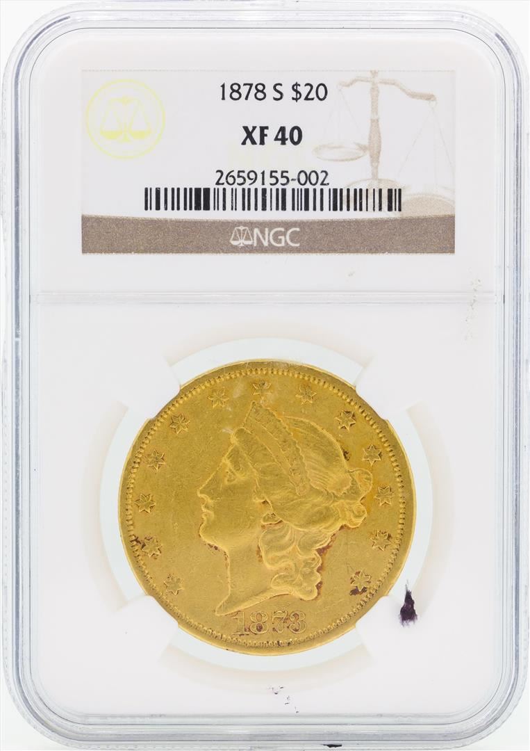 One 1878-S $20 Liberty Head Double Eagle Gold Coin NGC XF40. NGC Certified.