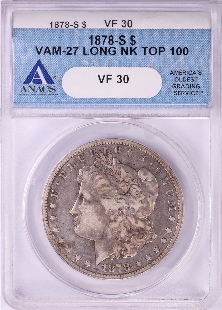 1878-S VAM-27 Long Neck $1 Morgan Silver Dollar Coin ANACS VF30 Top 100