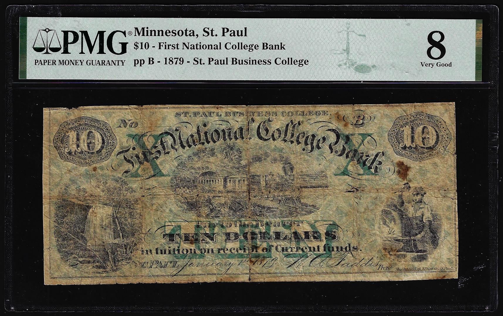1879 $10 First National College Bank Minnesota St. Paul Obsolete Scrip PMG Very Good 8