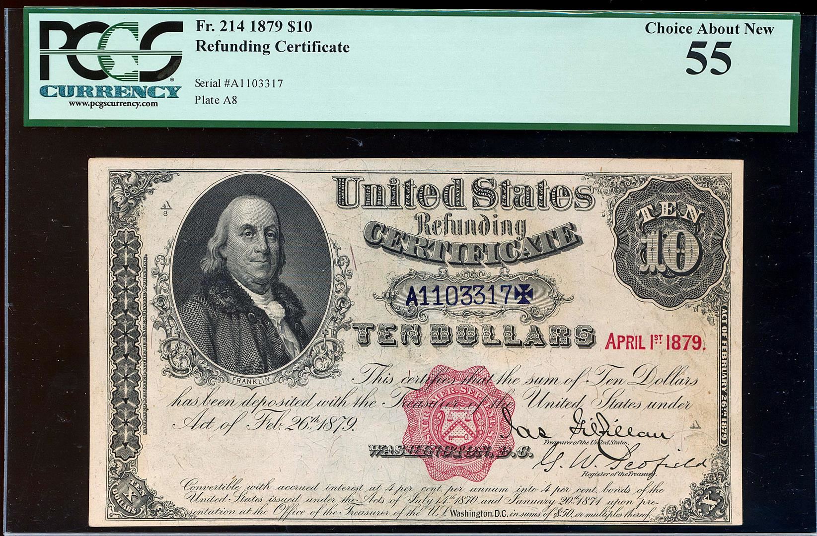 One 1879 $10 Refunding Certificate Fr.214 PCGS Choice About New 55. PCGS Graded.