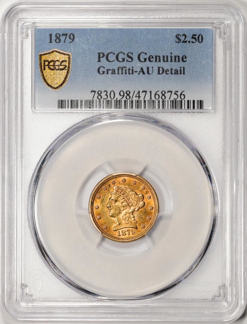 One 1879 $2 1/2 Liberty Head Quarter Eagle Gold Coin PCGS Genuine Graffiti AU Detail. PCGS Graded.