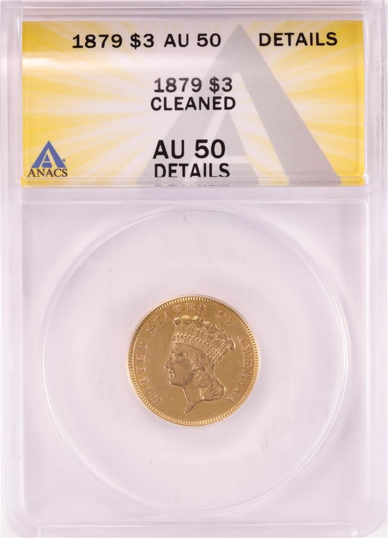 One 1879 $3 Indian Princess Head Gold Coin ANACS AU50 Details. ANACS Certified.