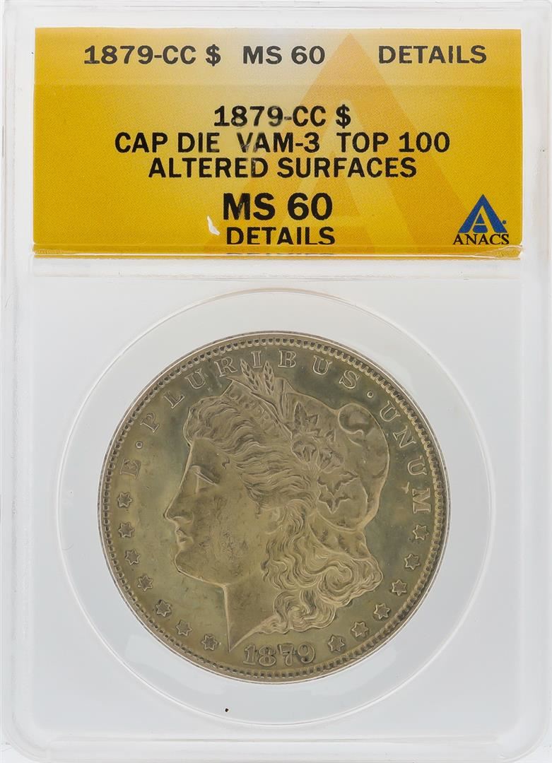 One 1879-CC $1 Morgan Silver Dollar Coin Cap Die VAM-3 ANACS MS60 Details. ANACS Certified.