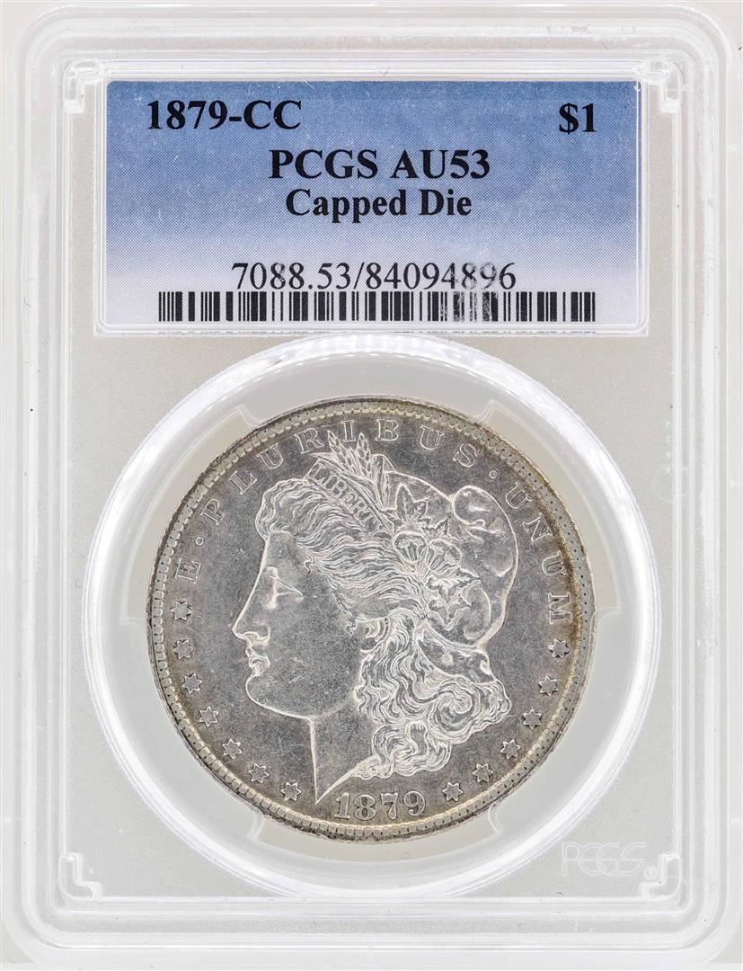 One 1879-CC Capped Die $1 Morgan Silver Dollar Coin PCGS AU53. PCGS Graded.