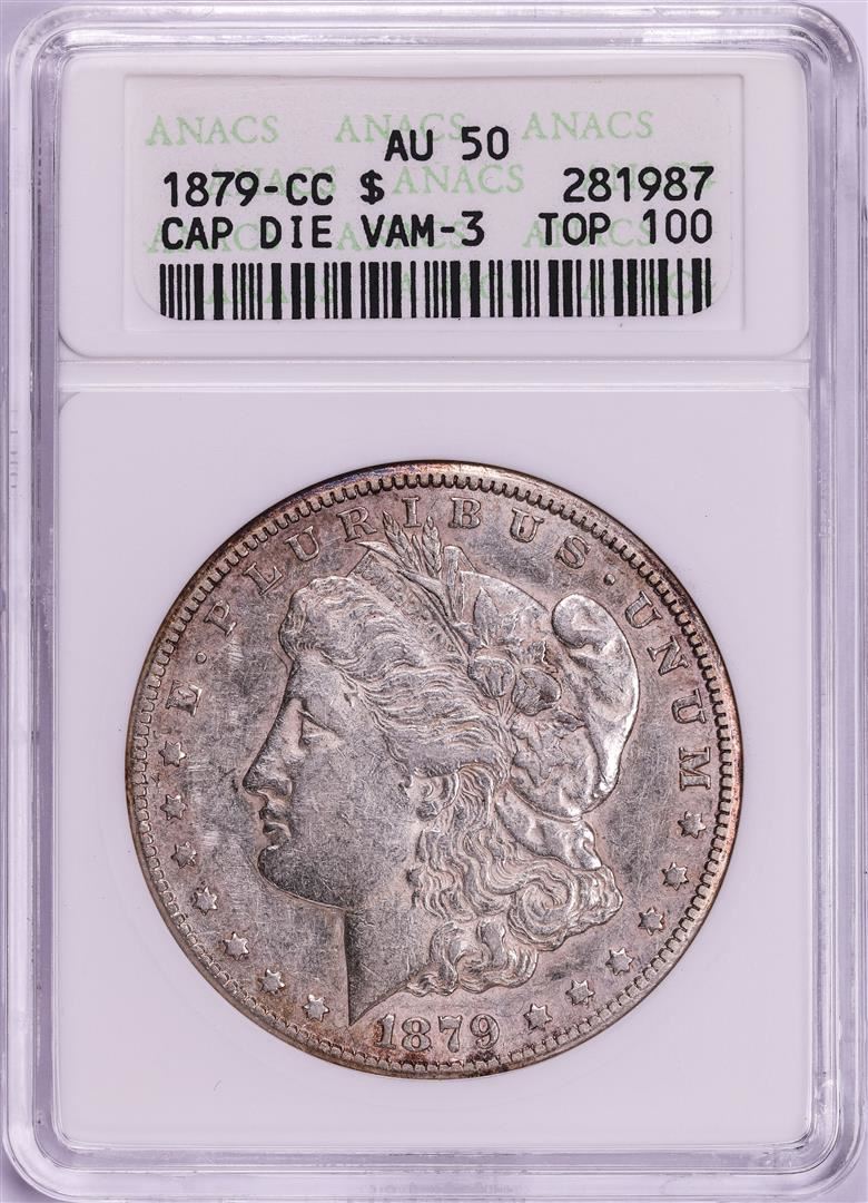 One 1879-CC Capped Die VAM-3 Top 100 $1 Morgan Silver Dollar Coin ANACS AU50. ANACS Certified.