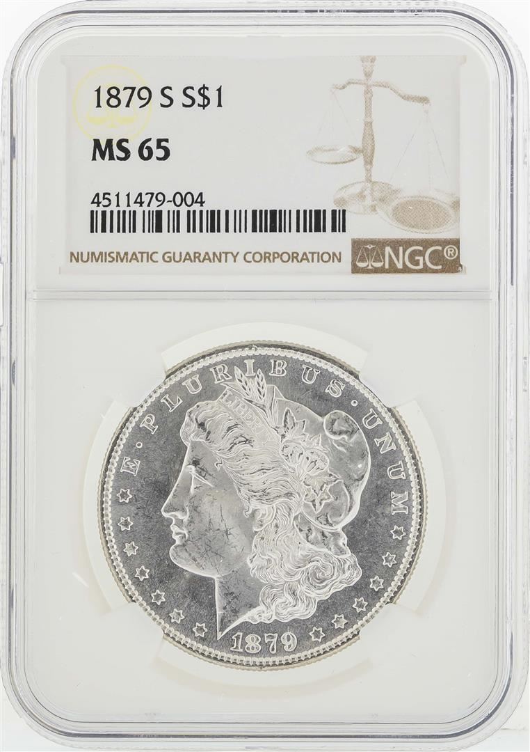 One 1879-S $1 Morgan Silver Dollar Coin NGC MS65. NGC Certified.