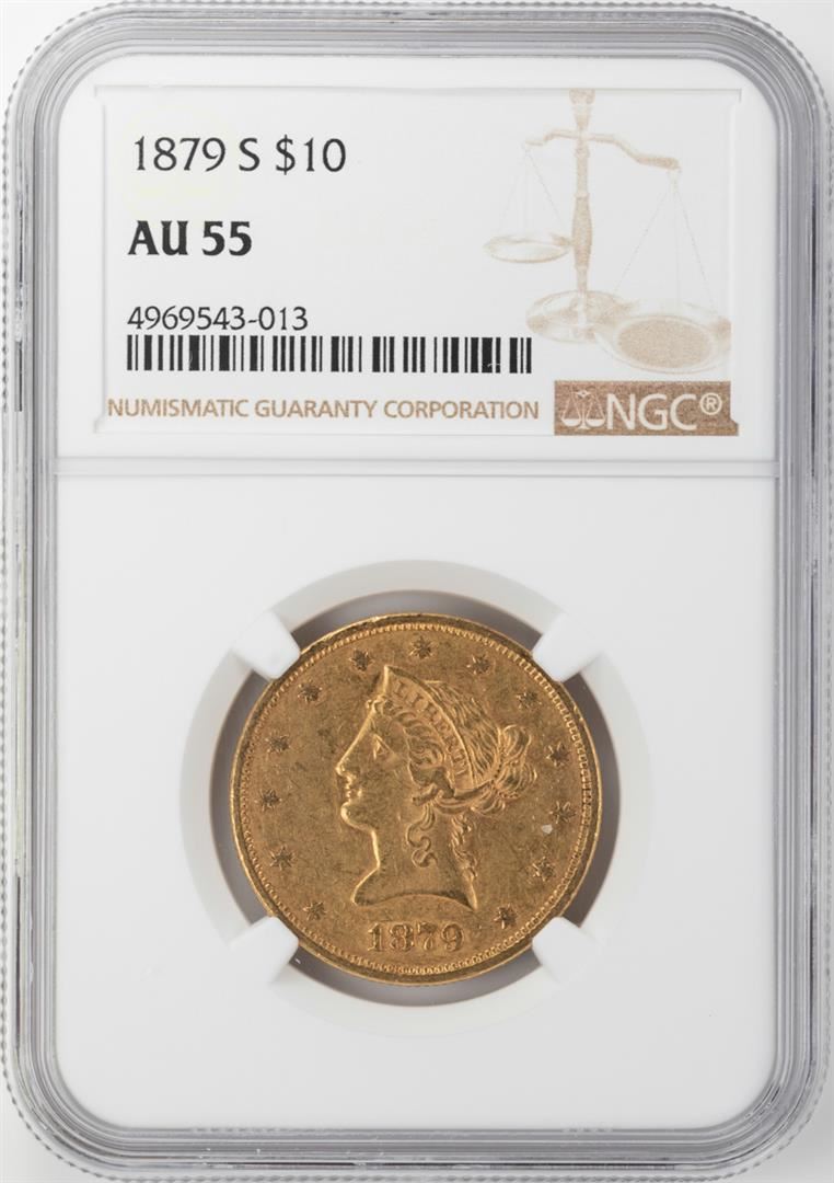 One 1879-S $10 Liberty Head Eagle Gold Coin NGC AU55. NGC Certified.