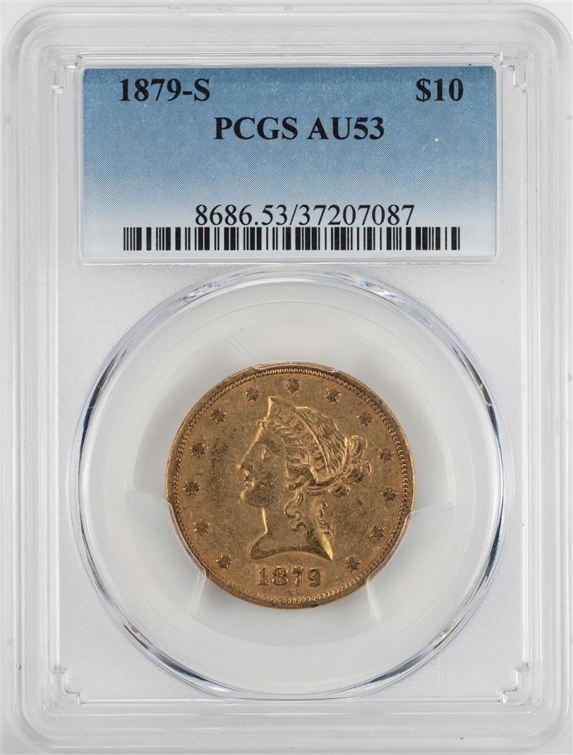 One 1879-S $10 Liberty Head Eagle Gold Coin PCGS AU53. PCGS Graded.