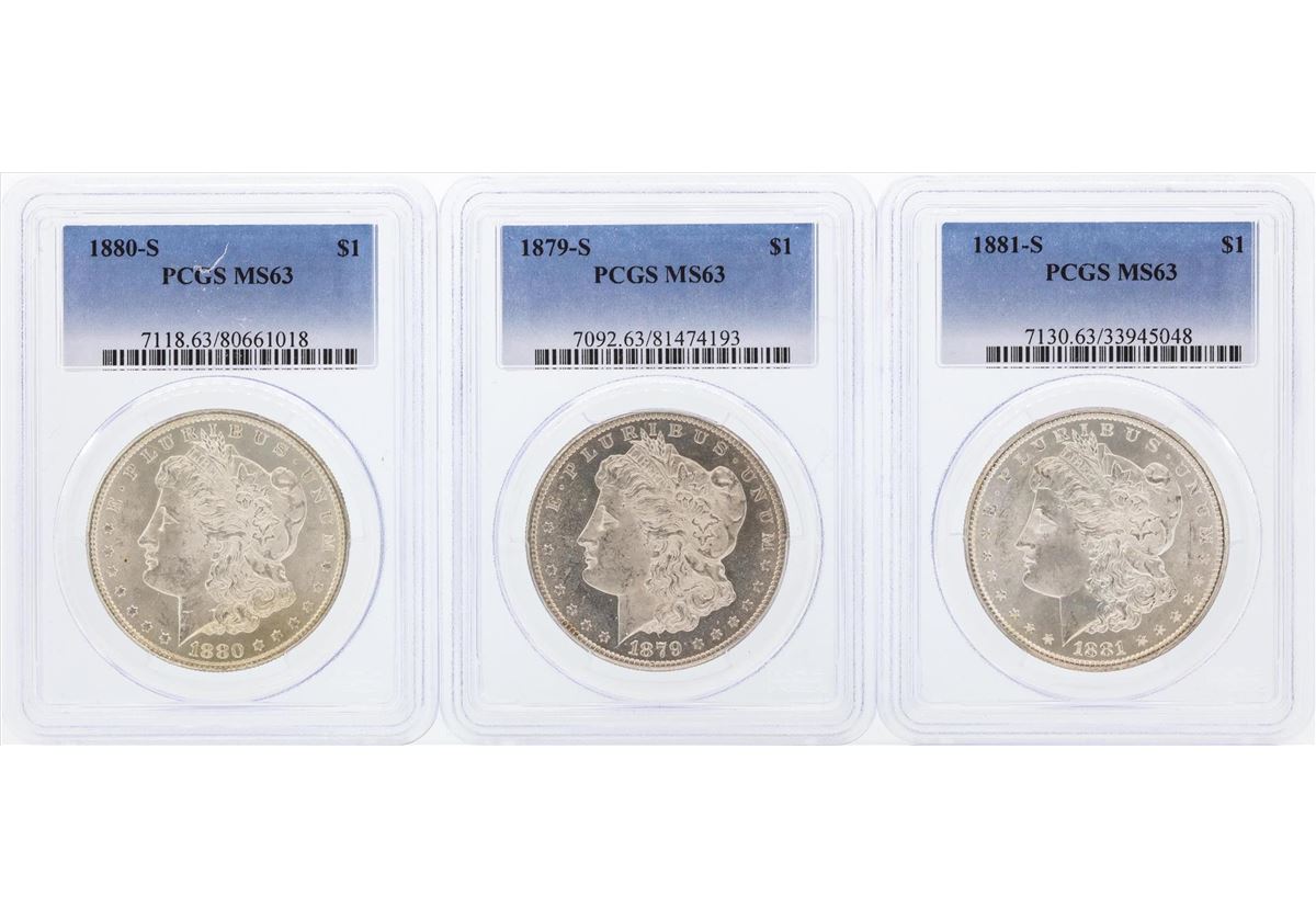 One 1879-S to 1881-S $1 Morgan Silver Dollar Coins PCGS MS63. PCGS Graded.