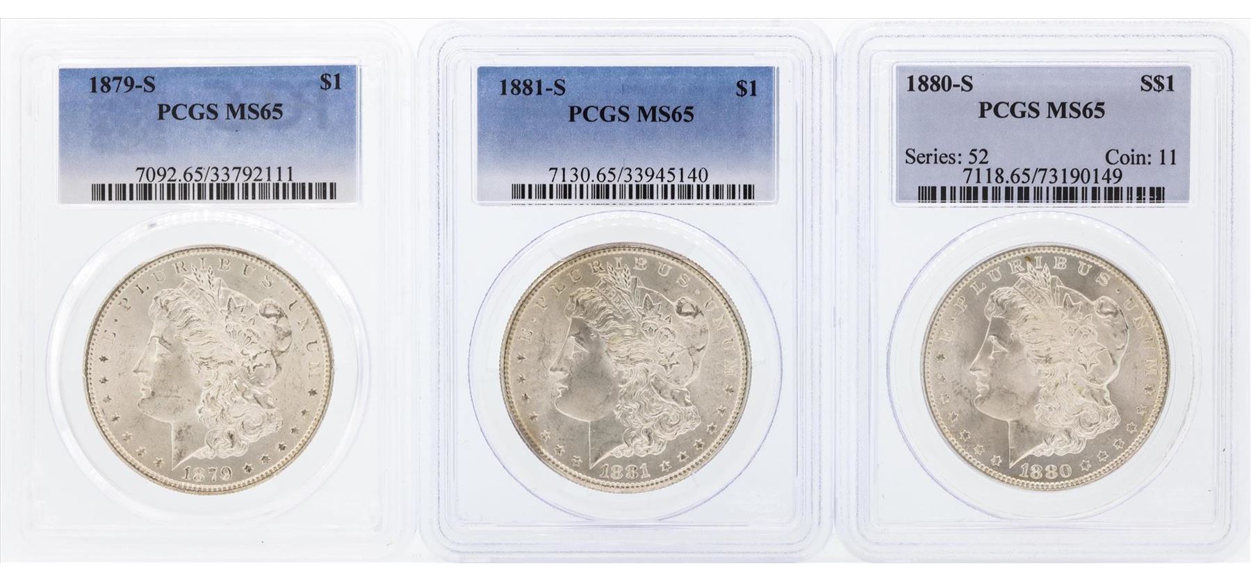 One 1879-S to 1881-S $1 Morgan Silver Dollar Coins PCGS MS65. PCGS Graded.