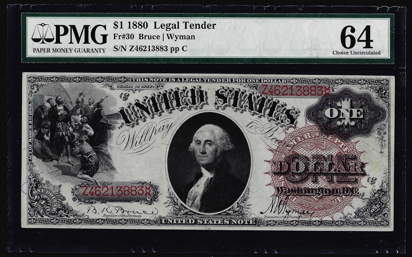 One 1880 $1 Legal Tender Note Fr.30 PMG Choice Uncirculated 64. PMG Certified.