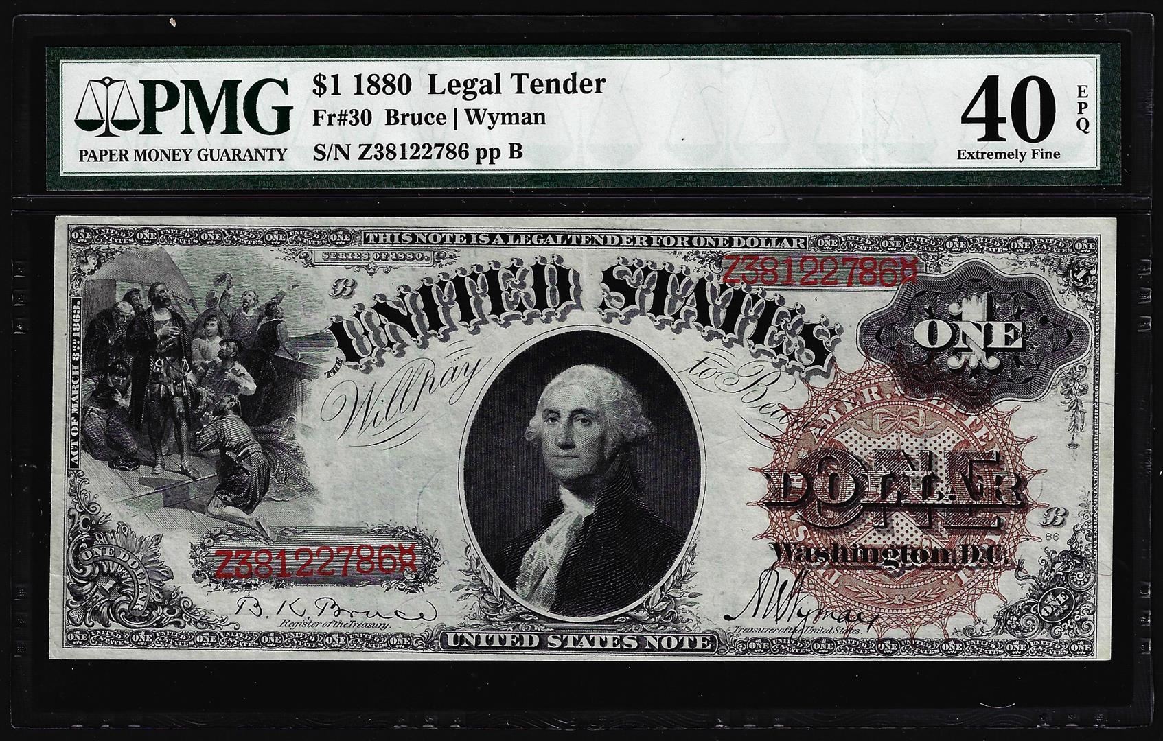 One 1880 $1 Legal Tender Note Fr.30 PMG Extremely Fine 40EPQ. PMG Certified.