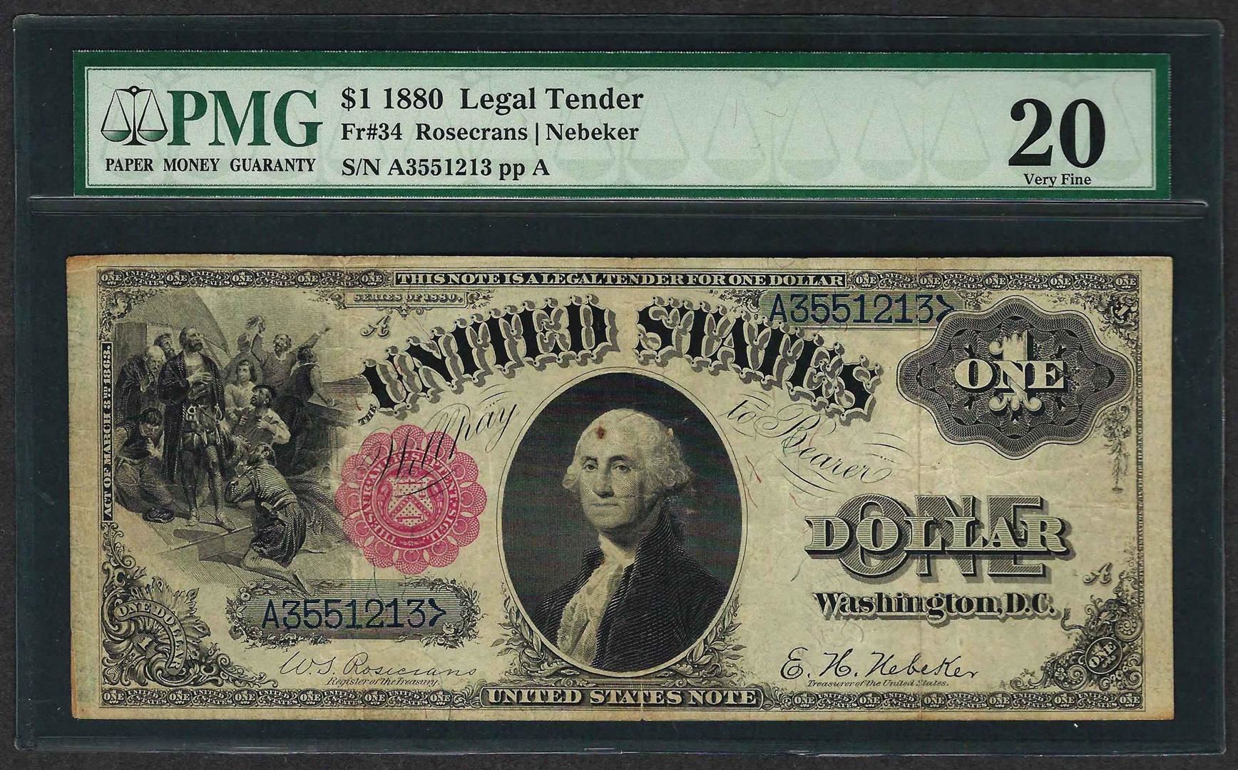 One 1880 $1 Legal Tender Note Fr.34 PMG Very Fine 20. PMG Certified.