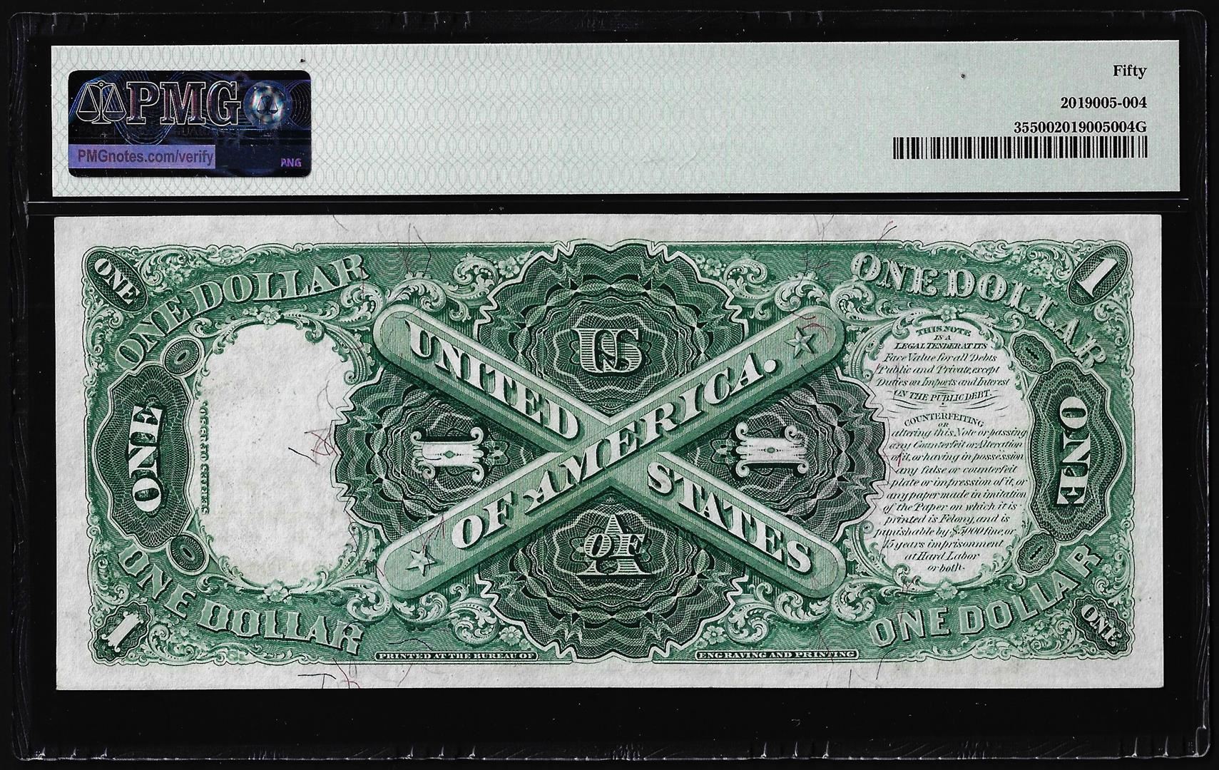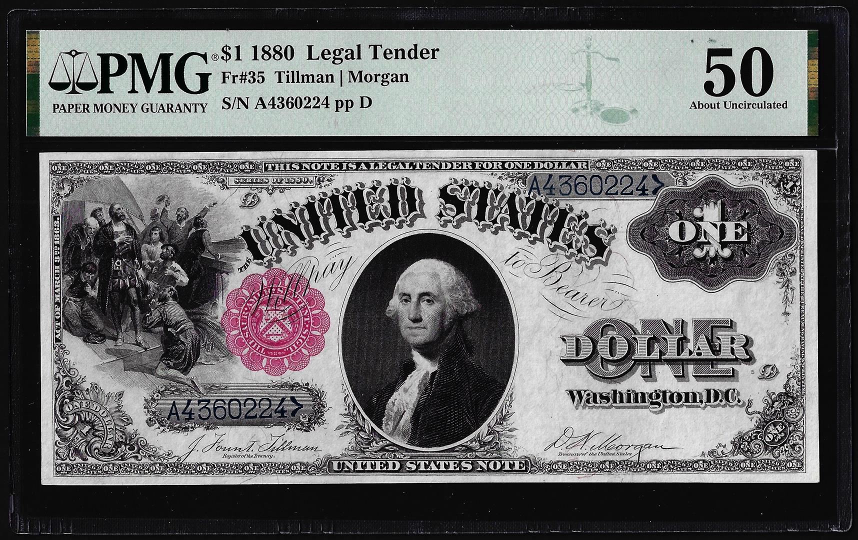 One 1880 $1 Legal Tender Note Fr.35 PMG About Uncirculated 50. PMG Certified.
